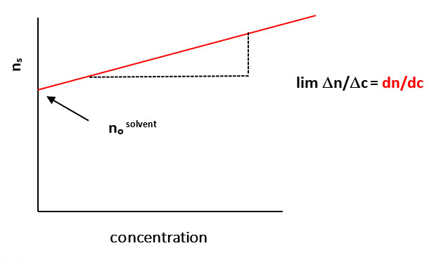 dn/dc 是折射率(ns)對(duì)濃度作圖并外推至零濃度時(shí)的斜率。其中,ns 是溶液的折射率。該斜率在很寬的濃度范圍內(nèi)通常呈線性,因此極限斜率往往與稀溶液條件下的斜率相同。