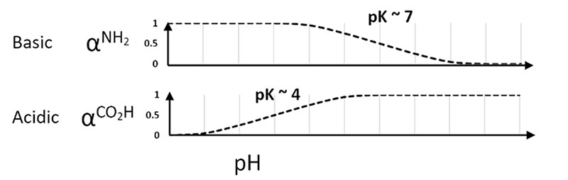 如圖1所示,堿性側鏈的電離度在低 pH 值時為1,此時胺帶正電(Z = +1),而在高 pH 值時質子被移除,電離度為0。酸性側鏈則相反,它們在低 pH 值質子化時呈中性,此時 Z = 0,而在高 pH 值去質子化時帶電,此時 Z = -1。